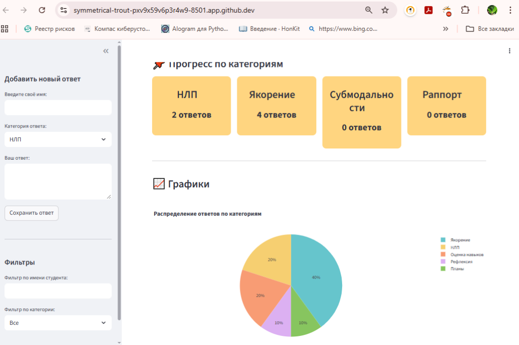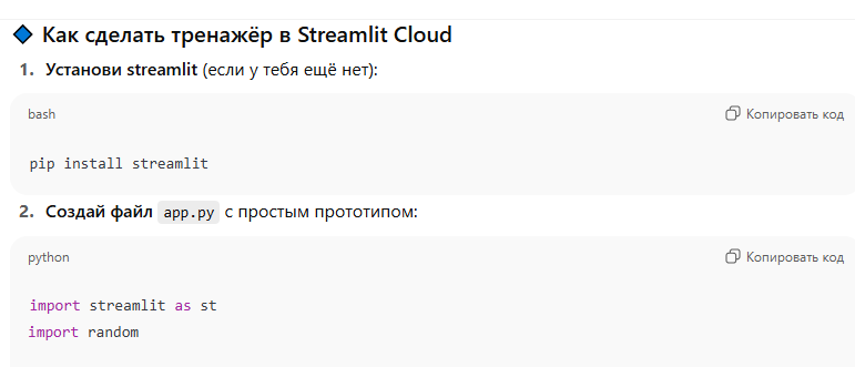 Я отправила запрос помощнику ИИ. Он выдал мне ряд ответов для реализации моей поставленной задачи. Задача стояла создать интерактивный тренажер, чтобы можно было отслеживать ответы участников курса.